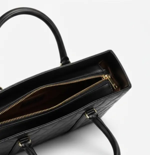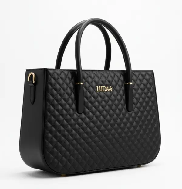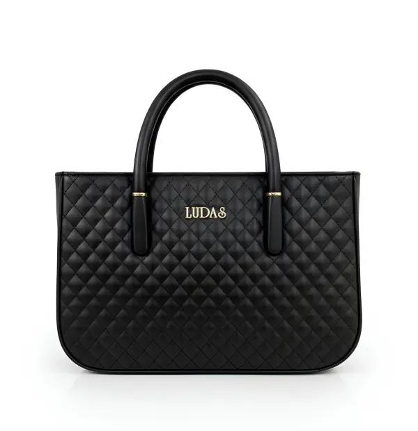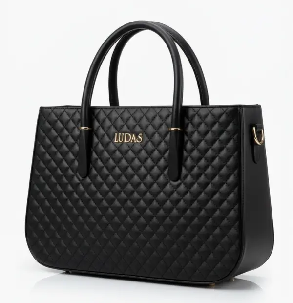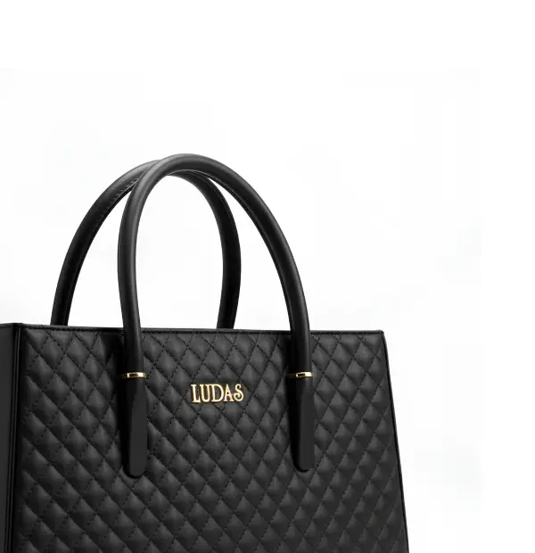 This elegant black handbag is crafted from quilted PU with a timeless diamond design, complemented by dual handles, gold accents, and a subtle metal logo on the front.