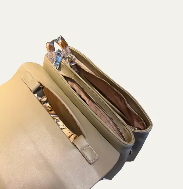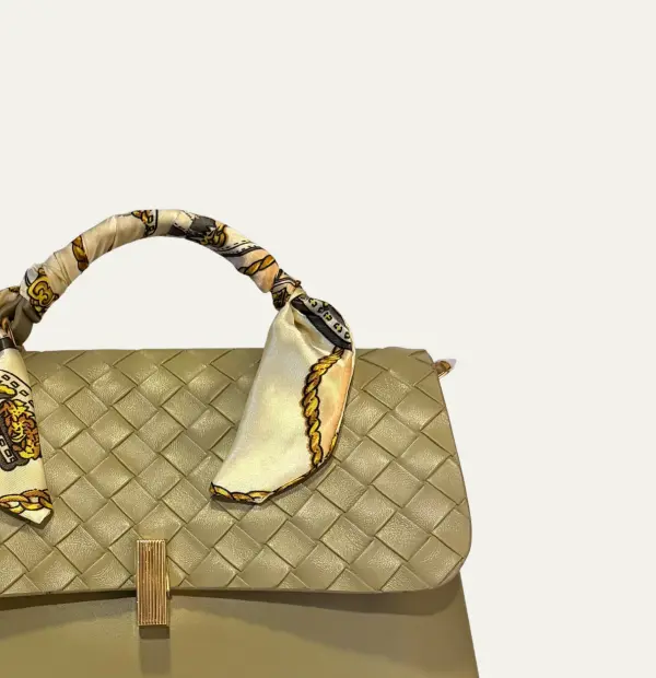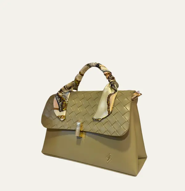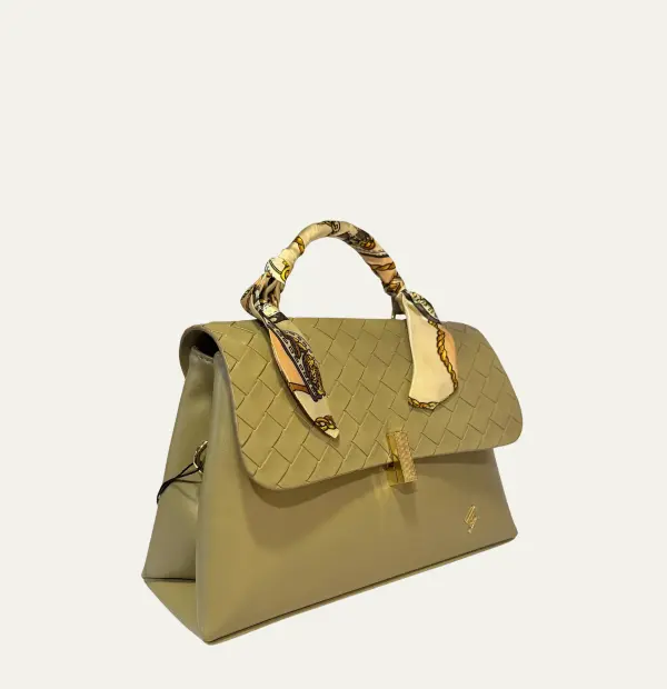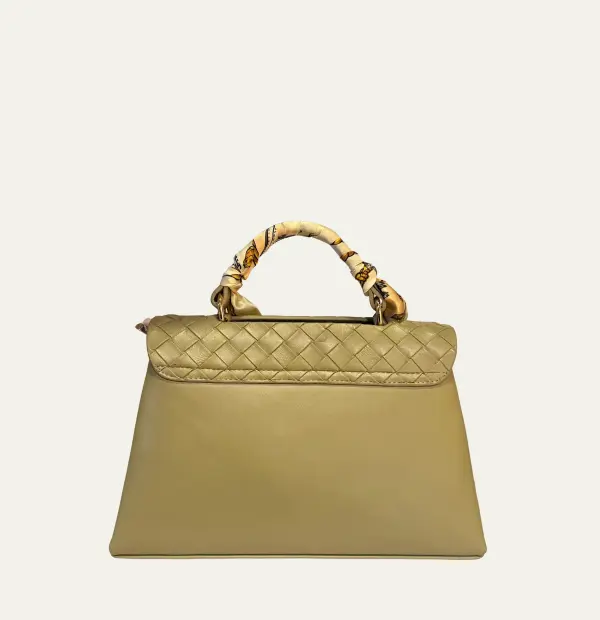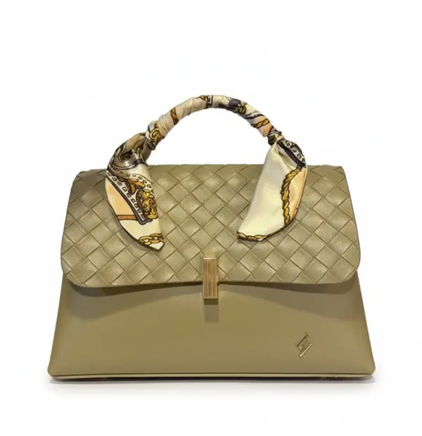 Designed in smooth olive PU, this refined piece showcases a decorative heat-pressed flap, a chic scarf-wrapped handle, a polished gold bar closure, and a minimal brand insignia.